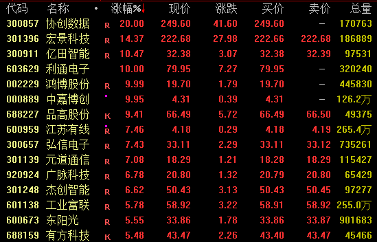 算力观点盘中强势拉升,截至收盘,协创数据20%涨停,宏景科技涨超14%,盘中涨停续立异高;利通电子、鸿博股分(维权)、中嘉博创等涨停,工业富联涨近6%。