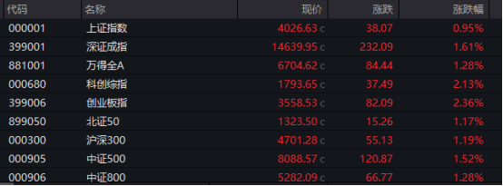 详细来看,沪指盘中强势震荡上扬,尾盘涨近1%;创业板指、科创综指较为强势。截至收盘,沪指涨0.95%报4026.63点,深证成指涨1.61%,创业板指涨2.36%,科创综指涨2.13%,沪深北三市合计成交约2.4万亿元,较此前一日增长逾2300亿元。